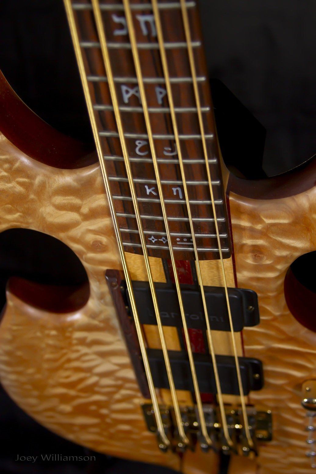 “On the second bass I made for him, my buddy came with me to Tiran’s house to help with the positioning of the pickups. We had already positioned one of the pickups right near the bridge, and then with the other two, we actually did something that I had done with a couple of clients. It was kind of crazy, but I made these little ramps, and we put the pickups above the strings, and we would move them around until you went, okay, that's the spot, that's the sound. Then everything would have to come off and then we’d route them in and then install them and everything. So, we actually routed two of those pickups in Tiran’s garage. Then we did all the wiring and assembly stuff on an island in his kitchen. And, of course, doing things like that usually takes two to three times longer than you expect. So, we were there for quite a while. This was specific to his ear and the sound that he wanted. Anybody that knows Tiran knows that he has the most amazing ears. He stopped playing fretted basses because of the tiny pitch difference. On the F on E the string the first fretted note was making him crazy. So, he said, "Well, I'm done with frets then, because I can just move my fingers and get it how I want it.” - Ken Lawrence, luthier and owner of Kenneth Lawrence Instruments, Arcata California