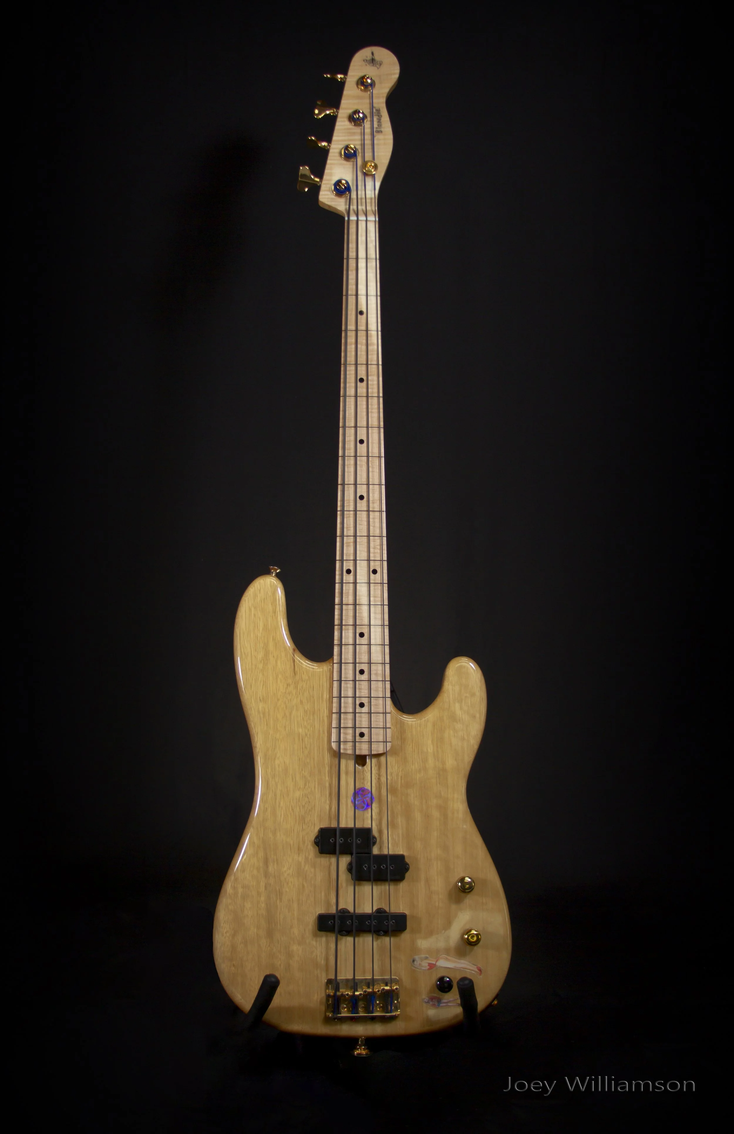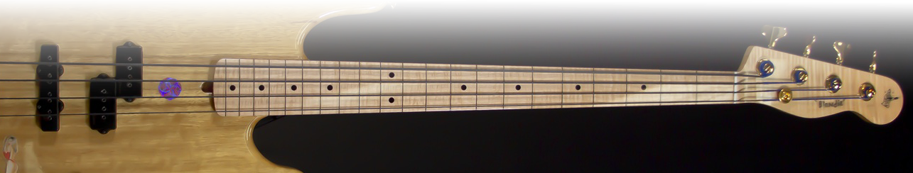 Blondie is one piece of korina, it’s very light and has a similar tonal quality like mahogany. It's not that heavy. And the neck is maple.Gibson used to make their Flying V guitars out of korina. They don't even have a korina where they can make a one-piece body out of it anymore. They have a limited supply of korina, so I was really lucky to get a full-body korina. There is one DiMarzio jazz pickup and one precision pickup. Sometimes I wanted a jazz type tone so I put the jazz bass pick up near the bridge. I usually keep it off, but when I want to mellow the tone a bit from the precision pick up, I would turn on the jazz pickup. And it makes the sound of the low notes a little less harsh.