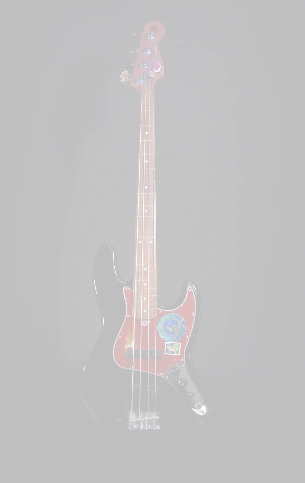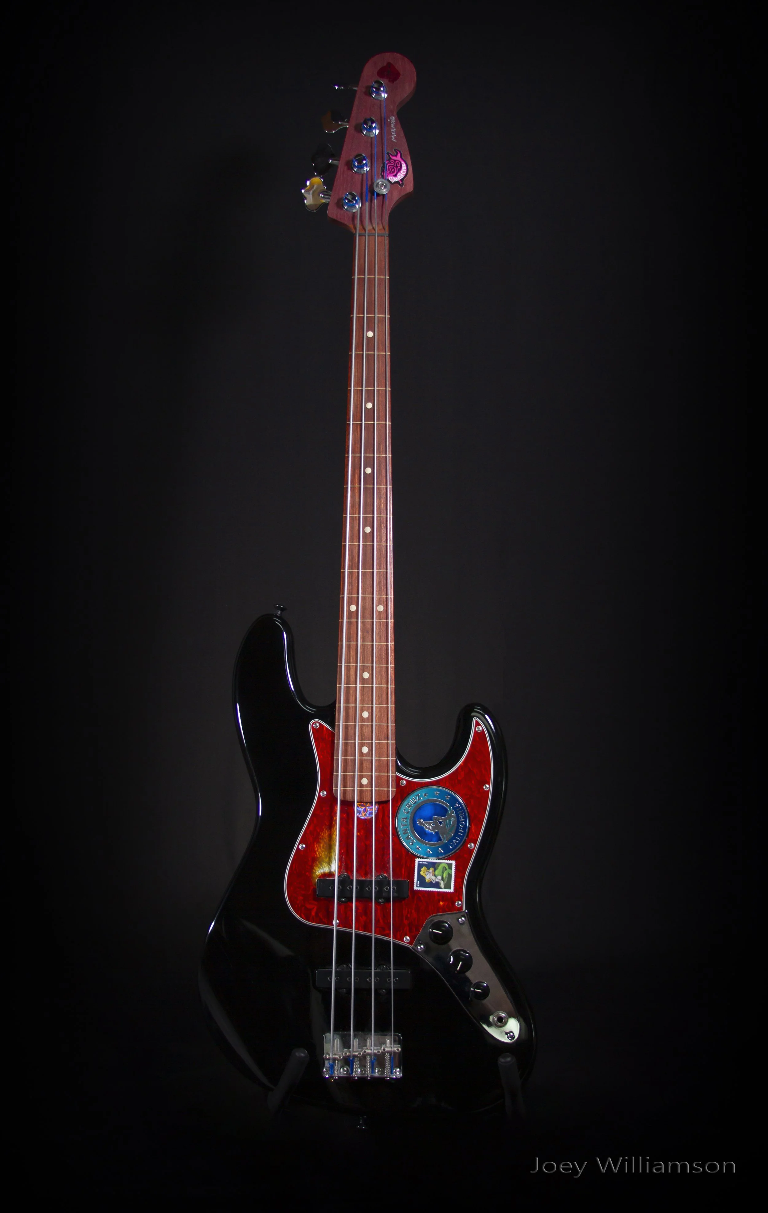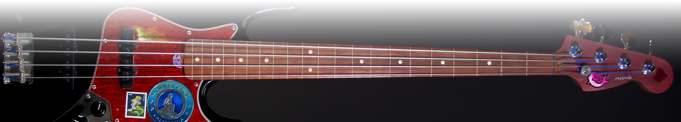 The Mermaid was originally a Fender Squier body, and I put a Warmoth neck on it. There were two or three basses that I bought as Fender Squire, mostly for the body, and then took the neck off and changed it to a fretless Warmoth. Squire is a cheap version of Fender's body that were first made in Japan and then they moved to China and Indonesia because of manufacturing costs.